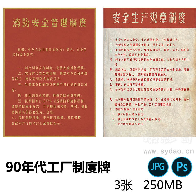 【内 容】3张90年代工厂消防安全管理制度、安全生产规章制度、应急预案管理制度墙贴设计PSD源文档戏用素材。